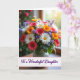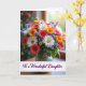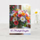 Designed with a lush, multi-colored bouquet as the main focus, this card places mixed blooms against a soft, sun-dappled background that feels like a quiet room shared with someone dear ❤️. White daisy-like flowers with golden centers mingle with deep red and bright orange blooms, their petals opening outward as if leaning toward one another. Small clusters of violet and blue florets tuck between layers of leafy green stems, adding gentle contrast and a cozy, close-knit look. The vase is simple and understated, letting the flowers carry the affectionate mood like a thoughtful gift set on a table. Soft light appears to drift in from an unseen window, warming the petals and giving the scene a tender, celebratory glow 🌼. Along the bottom, a narrow banner holds the message “To a Wonderful Daughter,” set in flowing deep purple lettering that stands out clearly against the lighter background. The backdrop stays softly blurred with hints of green and golden tones, keeping attention on the bouquet and the purple text at the base.