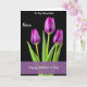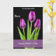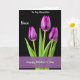 The front design shows three small flower buds in rich magenta-purple rising from slender, bright green stems against a deep, nearly black background, with lots of open space that makes them feel quietly intimate ❤️. Soft, focused lighting glides over the petals, shifting from deep violet shadows to glowing magenta highlights, like a gentle glance shared between close friends. Crisp green foliage near the stems adds a fresh accent, balancing the dark setting with a calm, living touch 🌼. Near the top, a white dedication line sits lightly above the flowers, spaced so it doesn’t crowd the blooms. Along the bottom edge, a deep lavender band stretches across the card, grounding the layout. Centered within that band, a thicker white message stands out clearly against the purple base. The purple tones in the petals echo the bottom band, tying the whole layout together. The three buds tilt slightly in different directions, their smooth petals catching light along the edges while the stems angle upward from the lower half.