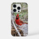 A cardinal, with its striking red plumage, stands prominently amidst a dry woodland scene. The surrounding area is a mix of fallen branches and sparse greenery, hinting at the transition between seasons. The cardinal’s vivid color contrasts sharply with the muted tones of the background.