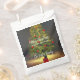 This customizable favor bag instantly captures the cozy holiday spirit with its striking, painterly design. The centerpiece is a classic Christmas tree, rendered in deep green, glowing with golden lights and adorned with vivid red ornaments. This festive scene is set against a dramatic, dark gray background, making the colors intensely vibrant. A small red wrapped gift anchors the base. The bag is fully personalized with a warm "Merry Christmas & Happy New Year" message followed by your family name. It's the perfect elegant packaging for treats and favors, merging timeless holiday cheer with a bespoke touch.