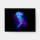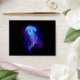 Large, blue, artistically drawn, glowing, bright jellyfish, with long tentacles on black background with purple bioluminescence. Luminous jellyfish.