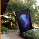 Large, blue, artistically drawn, glowing, bright jellyfish, with long tentacles on black background with purple bioluminescence. Luminous jellyfish.