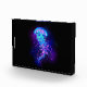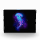 Large, blue, artistically drawn, glowing, bright jellyfish, with long tentacles on black background with purple bioluminescence. Luminous jellyfish.