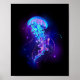 Large, blue, artistically drawn, glowing, bright jellyfish, with long tentacles on black background with purple bioluminescence. Luminous jellyfish.
