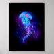 Large, blue, artistically drawn, glowing, bright jellyfish, with long tentacles on black background with purple bioluminescence. Luminous jellyfish.