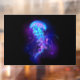 Large, blue, artistically drawn, glowing, bright jellyfish, with long tentacles on black background with purple bioluminescence. Luminous jellyfish.