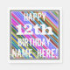 This fun birthday-themed paper napkin design features a message like "HAPPY 12th BIRTHDAY, NAME-HERE!", where the name can be customized. The background features a vibrant, multicolored stripes pattern. The message text is colored white, and has a distressed appearance. Napkins like these could perhaps be used at a birthday party for somebody who is celebrating their twelfth birthday. [~Z0000270]