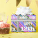 This fun birthday-themed wrapping paper design features a message like "HAPPY 12th BIRTHDAY, NAME-HERE!", where the name can be customized. The background features a vibrant, multicolored stripes pattern. The message text is colored white, and has a distressed appearance. Wrapping paper like this could perhaps be used when wrapping gifts or presents being given to somebody who is celebrating their twelfth birthday. [~Z0000272]