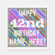 This fun birthday-themed paper napkin design features a message like "HAPPY 42nd BIRTHDAY, NAME-HERE!", where the name can be customized. The background features a vibrant, multicolored stripes pattern. The message text is colored white, and has a distressed appearance. Napkins like these could perhaps be used at a birthday party for somebody who is celebrating their forty second birthday. [~Z0000270]