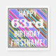 This fun birthday-themed paper napkin design features a message like "HAPPY 63rd BIRTHDAY, FIRSTNAME!", where the name can be customized. The background features a vibrant, multicolored stripes pattern. The message text is colored white, and has a distressed appearance. Napkins like these could perhaps be used at a birthday party for somebody who is celebrating their sixty third birthday. [~Z0000270]