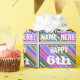 This fun birthday-themed wrapping paper design features a message like "HAPPY 6th BIRTHDAY, NAME-HERE!", where the name can be customized. The background features a vibrant, multicolored stripes pattern. The message text is colored white, and has a distressed appearance. Wrapping paper like this could perhaps be used when wrapping gifts or presents being given to somebody who is celebrating their sixth birthday. [~Z0000272]