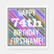 This fun birthday-themed paper napkin design features a message like "HAPPY 74th BIRTHDAY, FIRSTNAME!", where the name can be customized. The background features a vibrant, multicolored stripes pattern. The message text is colored white, and has a distressed appearance. Napkins like these could perhaps be used at a birthday party for somebody who is celebrating their seventy fourth birthday. [~Z0000270]