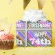 This fun birthday-themed wrapping paper design features a message like "HAPPY 74th BIRTHDAY, FIRSTNAME!", where the name can be customized. The background features a vibrant, multicolored stripes pattern. The message text is colored white, and has a distressed appearance. Wrapping paper like this could perhaps be used when wrapping gifts or presents being given to somebody who is celebrating their seventy fourth birthday. [~Z0000272]