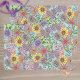 This tissue paper is a beautiful representation of a blooming garden. The backdrop is a soft teal canvas that serves to accentuate the vibrant colors of the blossoms. The flowers, in hues of yellow, pink, purple, and red, are intricately detailed with delicate lines showcasing their unique petal structures. Amidst these blooms, green leaves and stems weave through, creating an interconnected floral display. The overall design is both elaborate and elegant, capturing the peak of a garden’s bloom on a single piece of tissue paper. It’s a delightful fusion of art and utility.