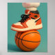 A dynamic and colorful sneaker design featuring bold contrasts in hue, balanced atop a basketball. The vivid color palette and modern styling make this image a standout piece for sneaker enthusiasts and streetwear lovers alike.