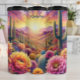 This breathtaking illustration captures a desert landscape bathed in the warm glow of a setting sun. Saguaro cacti stand tall amongst a field bursting with colorful blooming desert flowers. Distant mountains fade into the radiant horizon, and birds fly across the painted sky, creating a vibrant and serene scene.