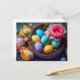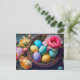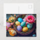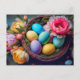 This holiday postcard features several colorful Easter eggs resting in a basket surrounded by some beautiful fresh flowers. You can also easily personalize the text inside this card to make this greeting feel more personal.