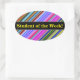 This sticker design features a vibrant and eyecatching striped pattern that features a variety of colors. It also features the message "Student of the Week!" in yellow text within a dark colored band. It could perhaps be used by a teacher, educator or tutor to acknowledge and praise a student who has had a very good week. [~Z0000052]