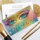This creative business card features striking gold and turquoise blue eyes, sparkling with glitter and gems, perfect for a makeup artist looking to make a bold statement. The vibrant and bohemian design is ideal for those specializing in theatrical, editorial, and special effects makeup. The dramatic and glam aesthetic appeals to clients seeking a professional cosmetologist with a flair for creativity.
