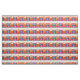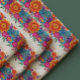 This fabric pattern features horizontal bands of vibrant, stylized flowers and foliage against a light background. Each band is a mirror image, showcasing a lively array of floral designs in bright orange, blue, purple, and pink hues. Smaller accent flowers and leaves in various shades of green and yellow fill in the gaps, creating a dense and festive floral border. The overall impression is one of a cheerful and colorful fiesta or folk-art inspired design.