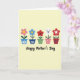Designed with a soft pale yellow background, this card shows five potted flowers lined up in a neat row like friendly companions sharing a quiet moment ❤️. Each plant has its own look, creating a gentle rhythm across the page, as if they’re leaning toward one another in cheerful agreement. On the left, a pink flower with a yellow center sits in a light blue pot marked with a small white daisy. Next is a blue flower with dotted petals and a sunny center, growing from a deeper blue pot. In the middle, a red flower with a wide smile and bright eyes rises from a light green pot with tiny yellow specks, giving it an affectionate, welcoming presence 🌼. Beside it, a white flower with rosy cheeks and a small smile rests in a pink pot dotted with little stars, followed by a red star-shaped flower with a white star at its center in a red pot with blue dots. The words “Happy Mother’s Day” appear centered beneath the plants in dark cursive lettering.
