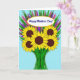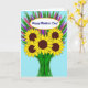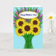 This card features a cheerful bouquet of five golden-yellow flowers with dark round centers, outlined in black for a friendly, cozy look ❤️. The blooms lean close together like a small gift being offered with care, with green stems gathered neatly at the base. A soft sky-blue background keeps the scene calm while making the warm petals stand out. Above the bouquet sits a white oval banner edged in gold, carrying a celebratory message in deep blue lettering. Behind the flowers, thin streaks in green, pink, and purple burst outward like festive rays, adding a sense of shared excitement between giver and receiver 🌼. The overall layout feels like a simple, affectionate exchange, as if the bouquet is being presented with a gentle smile. The message is centered inside the oval near the top, while the bouquet fills the middle and lower area, framed by the colorful streaks. The petals are golden with five distinct blooms, each with a dark circular center and crisp black outlines.