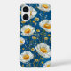 Vibrant floral pattern featuring large, white flowers with yellow centers. These blooms have a rich, textured appearance and stand out against a deep navy blue background. The arrangement includes various sizes of flowers, some fully open and others in bud form, surrounded by delicate green foliage and small, subtle wildflowers. The contrast of the bright white and yellow against the dark background creates a lively and striking visual effect, evoking a sense of freshness and natural beauty.