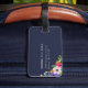 Floral luggage tag with a pretty hand-drawn pattern of flowers in pink, yellow, white, and purple, and butterflies in matching colors on a dark blue background. Personalize with your name on one side, and your name and address on the other.