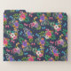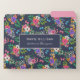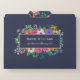 A set of floral file folders where two of the folders feature a colorful floral pattern with roses, wildflowers, berries, greenery, and butterflies in pink, yellow, and purple. One with a dark blue background, the other with a white background. The third folder is dark blue with a flower bouquet. Personalize each folder with your name and additional text.