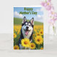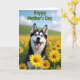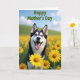 This card features a black-and-white dog with striking blue eyes sitting in a wide field of golden yellow flowers, looking straight out with an open-mouthed grin and tongue out ❤️. The blossoms crowd around the pup like a sunny bouquet, and the bright petals make the dark patches of fur stand out. Behind the dog, soft green hills roll into the distance, adding a calm backdrop that feels like a shared walk on a spring morning. A light blue sky stretches above, with a few pale clouds drifting by like gentle brushstrokes. The dog’s eager gaze and relaxed posture bring a friendly, affectionate energy to the scene, like it’s greeting someone it loves. Across the top, the words “Happy Mother’s Day” appear in green lettering, centered and easy to read 🌼. The closest flowers are detailed and sunlit, with layered petals and small stems overlapping near the bottom edge.