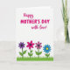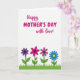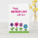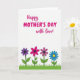 Designed with a bright white background, this card features the message “Happy MOTHER’S DAY with love!” across the top, setting a sweet, affectionate tone ❤️. The word “Happy” sits near the upper left in a flowing fuchsia style, with “MOTHER’S DAY” centered beneath it in larger, thicker fuchsia letters. “with love!” appears just below and slightly to the right, also in fuchsia, like a soft add-on that feels like a gentle hug in words. The open space around the text keeps everything easy to read and lets the message feel airy and light. Along the lower third, a narrow band of green grass stretches straight across, grounding the design like a small garden scene. Rising from the grass are four simple flowers with outlined petals: one deep purple, one bright pink, one rich magenta, and one blue flower with a yellow center 🌼. The flowers are evenly spaced, with slim stems and rounded petals that stand out crisply against the white background.