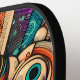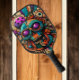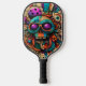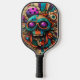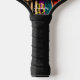 A paddle with a colorful design, ready for a game of pickleball. The bright colors add a fun and artistic touch to the traditional paddle.