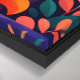 Bring bold color and dreamy charm into your space with this vibrant geometric cat canvas print. This modern abstract illustration features a graceful curled cat formed from rich, overlapping color blocks in warm oranges, coral, teal, pink, and deep purple.