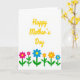 This greeting card features a bright graphic layout that catches the eye with strong color contrasts on a white background. Near the top, a short message sits centered in a smooth yellow lettering style, like a sunny note meant for someone close ❤️. The words float with plenty of space around them, giving the design an airy, open feel. Along the bottom third, a tidy row of simplified flowers spreads across the card like a shared garden moment between friends. The blooms vary in size and color—deep pink, sky blue, and orange—with golden yellow centers that feel like little nods of affection 🌼. Each flower rises on a green stem, and a few stems include small leaves that add gentle movement without extra fuss. The background stays plain white so the yellow text and the colorful petals stand out clearly. The lower edge is filled with those bright blossoms, their round yellow centers repeating across the line of green stems.