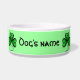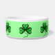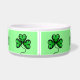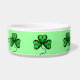 Beautiful lucky shamrocks in bright green with an elegant black border with a green background on a dog food dish to personalize with your dog's name. I really love how this turned out.