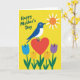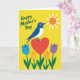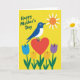 This design shows a large crimson heart centered on a sunny yellow background, setting a cheerful, affectionate tone ❤️. Sitting calmly on top of the heart is a small bird in deep blue and white, angled as if keeping gentle watch over the scene below. Along the bottom, four simple tulip-like flowers rise on thin green stems, their petals colored blue, golden yellow, and purple, like a friendly garden in early spring 🌼. In the top right corner, a small sun with an orange center and short white rays adds a bright, cozy touch. In the top left corner, the words “Happy Mother’s Day” appear in dark green, written in a flowing style that curves lightly across the space. The heart and bird feel close and protective together, while the flowers below look like they’re reaching up toward them in quiet admiration. The background remains a solid yellow field with no extra patterns, keeping the heart, bird, flowers, and sun as the main shapes.