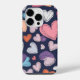 Brighten up your phone with this eye-catching iPhone case featuring a playful and romantic pattern of colorful hearts. The vibrant design showcases hearts in various shades of pink, blue, purple, and orange, scattered across a stylish dark blue background. Some hearts have outlined edges for added dimension, while others are filled in for a bold look.