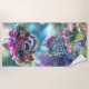 This beach towel features a striking and unique design, showcasing a skeleton adorned with a vibrant floral crown and garland. The skeleton stands amidst a lush garden filled with colorful flowers and greenery, creating a captivating blend of the macabre and the beauty of nature. The floral crown includes shades of pink, purple, red, and white, complemented by green foliage, while the background offers a dreamy, ethereal atmosphere with soft bokeh effects. Perfect for making a bold statement at the beach, this towel combines functionality with artistic flair
