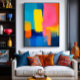 Bold layers of intense color blocks create an abstract landscape pulsing with energy. Blue, pink, yellow, and orange interact in a vibrant and dynamic harmony.