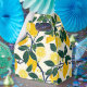 The pattern features a lively and vibrant design with lush lemon trees. The branches are adorned with ripe, bright yellow lemons, some of which are sliced open to reveal their juicy interiors. The lemons are surrounded by deep green leaves, which contrast beautifully with the warm, cream-colored background. The overall style is bold and stylized, with clean lines and a sense of symmetry, creating a fresh and cheerful aesthetic that evokes a Mediterranean vibe.