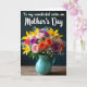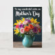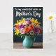 This card features a lush bouquet arranged to feel like a gentle embrace between loved ones ❤️. Soft pink, orange, deep red, and purple roses mingle with sunny yellow lily petals, while tiny white filler flowers thread through the bunch like quiet little compliments. The flowers sit in a glossy aqua pitcher-shaped vase that catches a bit of light along its curved rim. It rests on a rustic wooden tabletop, adding a cozy, at-home setting that suggests a caring gesture shared across the table. Near the top, the message “To my wonderful sister on Mother’s Day” appears in white, flowing lettering, centered above the bouquet so it reads first without crowding the flowers 🌼. Behind everything, a deep muted teal background keeps the focus on the blooms, making their colors stand out with a soft, romantic warmth. Small highlights glint on the vase and a few petals, and the wood grain runs horizontally beneath the arrangement.