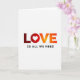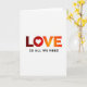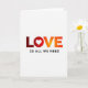 This card features a white background with the large word “LOVE” centered and filling most of the space, with a heart shape standing in for the “O” 🥰. The letters use a smooth gradient that starts in deep maroon-red at the “L,” warms through orange tones across the middle, and ends in bright yellow at the “E,” like a slow glow spreading across the page ❤️. That heart-shaped “O” sits snugly between the “L” and “V,” giving the word a close, affectionate feel, as if the letters are leaning toward each other. Beneath the main word, the phrase “IS ALL WE NEED” appears in smaller, plain black sans-serif text, centered and spaced neatly under “LOVE.” The contrast between the dark lower line and the warm upper colors keeps the layout easy to read while still feeling romantic. There are no characters or scenery, just the simple pairing of a heart and warm color that suggests closeness without needing extra imagery. Overall, the design stays minimal with lots of open white space around the centered text and the red-to-yellow gradient across “LOVE.”