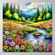 Colorful meadow showcasing a variety of wildflowers and a gentle stream flowing through, surrounded by trees and mountains. Captures nature's vibrant beauty, serenity, and tranquility.
