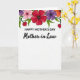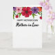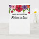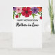 Designed with a bright floral arch across the top, this Mother’s Day card sits on a white background that leaves plenty of open space below. The flowers cluster in the upper area in reds, soft pinks, deep purples, and warm oranges, with dark centers that add contrast. Curved green leaves weave between the blooms, and two small red hearts nestle in the foliage for a gentle touch of affection ❤️. Centered beneath the flowers, the text “HAPPY MOTHER’S DAY” appears in black, in a straightforward sans‑serif style that’s easy to read. Directly below, “Mother-in-Law” is written in black with a flowing, cursive look that feels softer and more intimate 🌼. The layout keeps the top border decorative while the lower portion stays airy and uncluttered, drawing the eye naturally from flowers to message. The two tiny hearts sit slightly off-center among the leaves near the top border.
