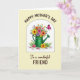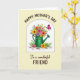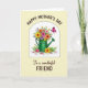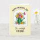 This card features a soft, creamy yellow background that feels gentle and welcoming, with an arched frame in the center like a little window into a garden scene. Inside the arch sits a deep green watering can holding a full bouquet, the blooms mixing sunny yellows, warm oranges, bright pinks, and light purples among leafy greens 🌼. A small fuchsia butterfly floats to the right of the flowers, adding a light, affectionate touch as if drawn to the sweetness of the moment ❤️. A few pink petals rest near the base of the watering can, giving the arrangement a natural, just-set-down look. Across the top, the words “HAPPY MOTHER’S DAY” curve in uppercase lettering, set in a dark tone that stands out clearly against the pale background. Beneath the arch, “To a wonderful FRIEND” appears in a flowing, cursive-style line, smaller than the headline and placed neatly under the garden scene. The arch is outlined in a thin, darker border, with the butterfly hovering near the right edge of the framed area.