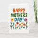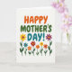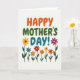 This design shows a white background topped with the text “HAPPY MOTHER’S DAY!” in rounded letters that feel gently uneven, as if drawn with care ❤️. “HAPPY” sits first in warm orange, “MOTHER’S” follows in leafy green, and “DAY!” finishes in deep teal with a jaunty exclamation mark. The message is centered and spaced comfortably, giving the words room to breathe while keeping them as the main focus. Below the text, a horizontal garden border stretches across the card, like a small bouquet laid at someone’s feet. Slender green stems with simple leaves hold up blossoms in yellow, red, purple, and sky blue, arranged at slightly different heights that suggest a close-knit, friendly gathering. Several flowers have contrasting centers—such as a bright yellow middle inside purple petals or a deeper orange center in a sunny yellow bloom—adding a tender, gift-like attention to detail 🌼. Along the bottom edge, the flowers form a neat band of color with green stems rising into the open white space.