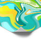 This design contains an abstract pattern with flowing, wave-like shapes in bright shades of turquoise, teal, yellow, and green. The composition suggests a sense of movement and energy, evoking natural elements like ocean waves or flowing water.
