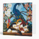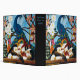 A calico cat lounges across a wooden tabletop, gently wrestling a fiery red Japanese dragon as if it were a favorite toy, blending playfulness with myth and imagination. Behind them, a brilliant stained glass peacock in jewel-toned feathers among blooming pink flowers, The artwork bursts with saturated color, intricate detail, and storybook charm, making it perfect for cat lovers, fantasy fans, and anyone who enjoys bold, decorative statement pieces filled with personality and magic.