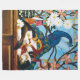 A calico cat lounges across a wooden tabletop, gently wrestling a fiery red Japanese dragon as if it were a favorite toy, blending playfulness with myth and imagination. Behind them, a brilliant stained glass peacock in jewel-toned feathers among blooming pink flowers, The artwork bursts with saturated color, intricate detail, and storybook charm, making it perfect for cat lovers, fantasy fans, and anyone who enjoys bold, decorative statement pieces filled with personality and magic.