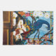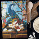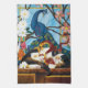 A calico cat lounges across a wooden tabletop, gently wrestling a fiery red Japanese dragon as if it were a favorite toy, blending playfulness with myth and imagination. Behind them, a brilliant stained glass peacock in jewel-toned feathers among blooming pink flowers, The artwork bursts with saturated color, intricate detail, and storybook charm, making it perfect for cat lovers, fantasy fans, and anyone who enjoys bold, decorative statement pieces filled with personality and magic.